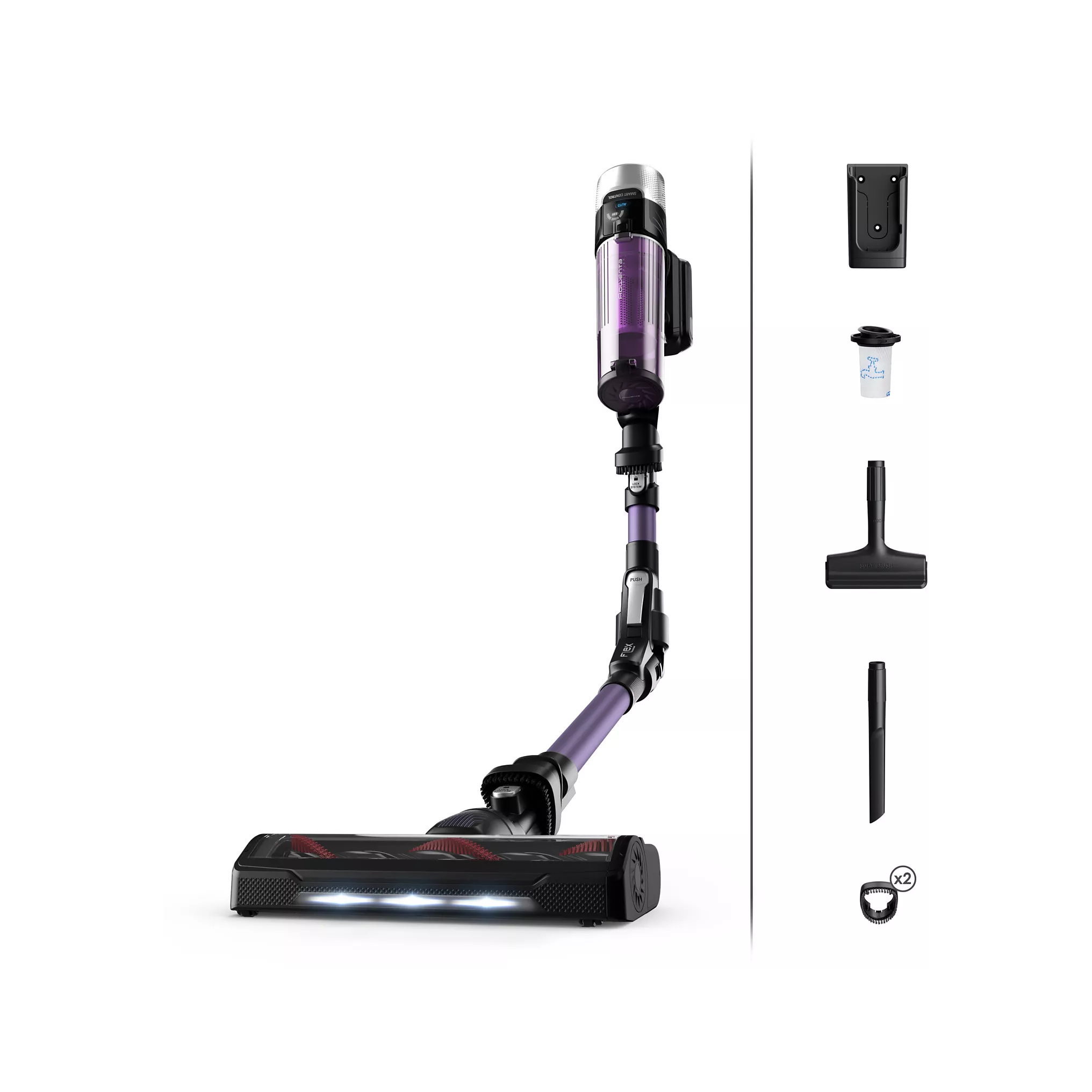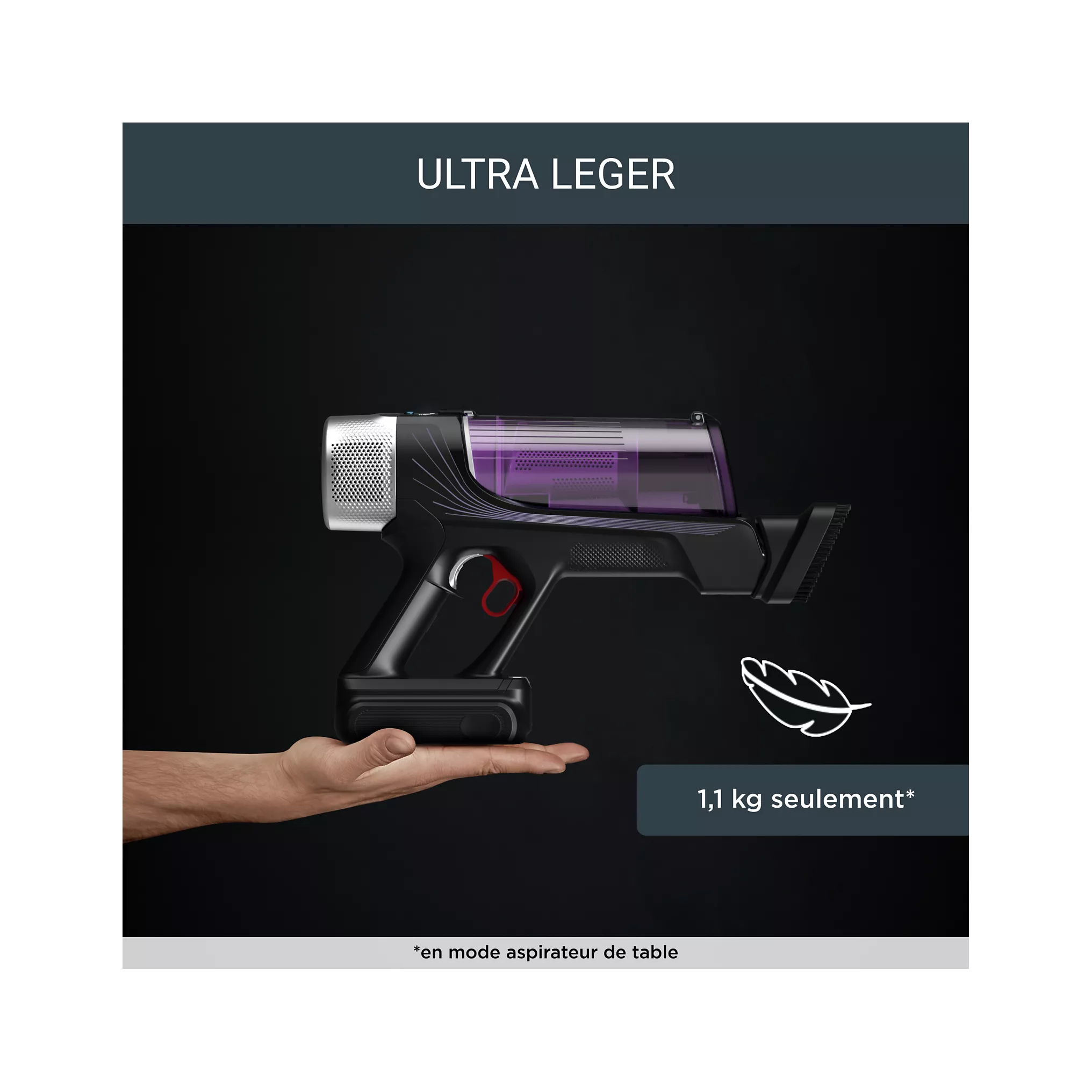 Le X-Force Flex 9.60 Allergy est conçu pour offrir une expérience de nettoyage optimale grâce à son format ultra-léger, pesant seulement 1,1 kg en mode aspirateur à main. Son tube flexible innovant permet d’atteindre les zones difficiles, comme sous les meubles bas, sans effort. La tête d’aspiration rectangulaire, équipée de LEDs, illumine les surfaces pour traquer la poussière invisible. Avec un niveau sonore de 83 dB(A), cet aspirateur assure un nettoyage discret. Le bac à poussière de 0,4 L et le filtre supplémentaire inclus facilitent l’entretien. Son design élégant en noir et violet s’intègre parfaitement dans tout intérieur moderne, tandis que sa base de charge pratique garantit un rangement facile. Avec un indice de réparabilité de 9,3 et une disponibilité des pièces détachées pendant 15 ans, le ROWENTA X-Force Flex 9.60 Allergy est un investissement durable pour votre maison.