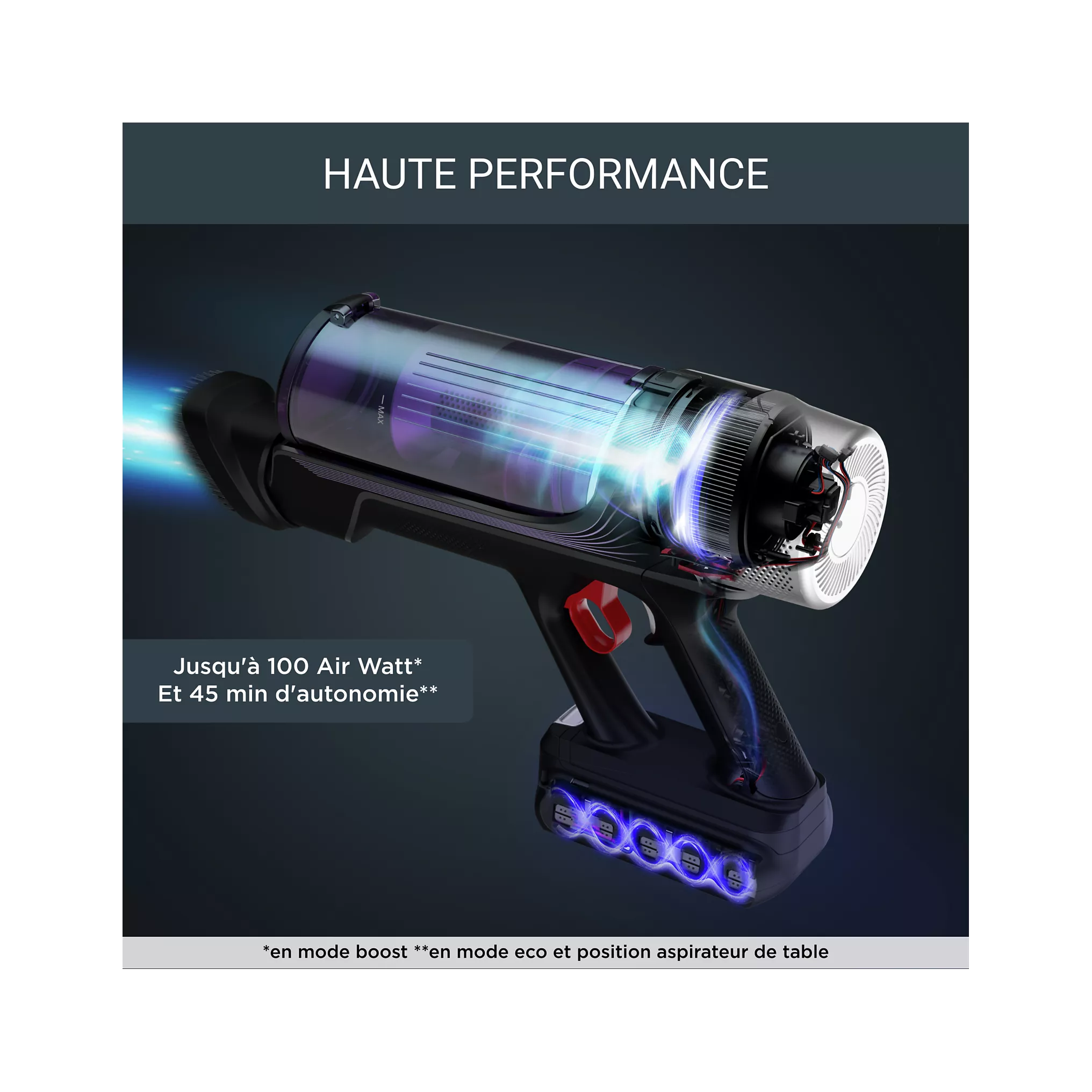 Le ROWENTA X-Force Flex 9.60 Allergy se distingue par sa grande puissance d’aspiration constante, atteignant jusqu’à 100 Air Watts grâce à son moteur digital avancé. Cette performance garantit un nettoyage en profondeur, même dans les zones les plus difficiles d’accès. Doté d’une technologie cyclonique, cet aspirateur balai sans fil assure une séparation efficace de l’air et de la poussière, capturant 99,9 % des particules fines, allergènes et acariens. Avec une autonomie maximale de 45 minutes en mode cleanette, il permet de nettoyer votre intérieur sans interruption. Son écran de contrôle digital intelligent vous offre la possibilité de gérer les vitesses et de surveiller l’autonomie restante, tout en vous alertant sur l’état du filtre.