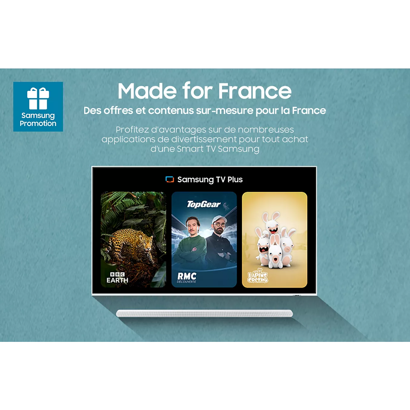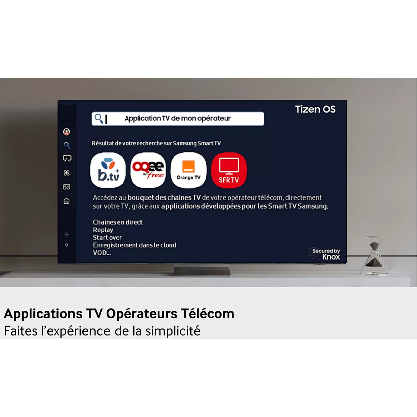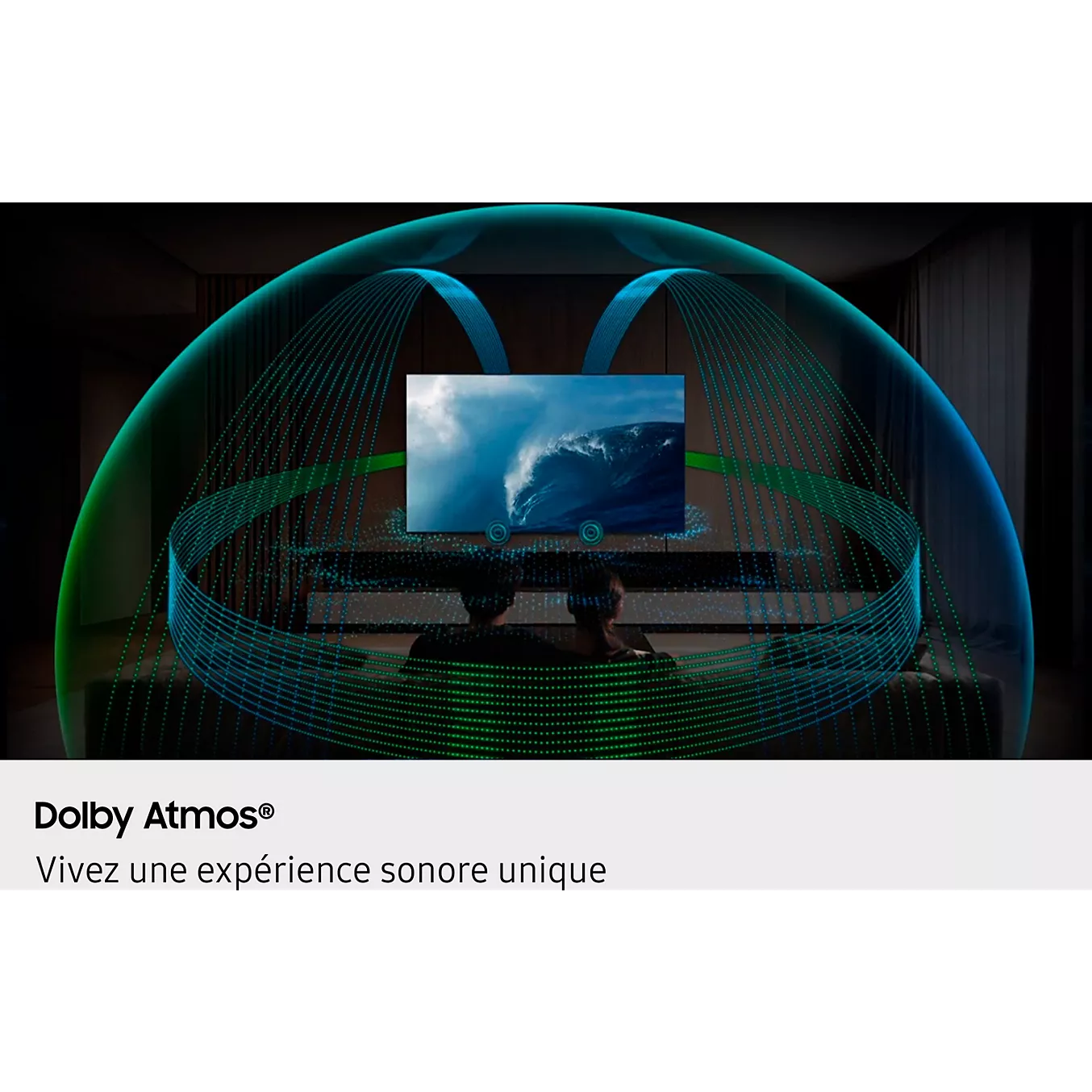 Ce téléviseur ne se contente pas d’une image parfaite, il propose également une expérience sonore ultime avec le son Dolby Atmos® sans fil et la technologie OTS Lite pour un son immersif. La puissance sonore de 30W répartie sur 4 canaux, combinée à la technologie Q-Symphony, offre une qualité audio exceptionnelle. En termes de connectivité, le TV est équipé de 4 ports HDMI, 2 ports USB-A, et prend en charge le Bluetooth 5.3. Les fonctionnalités intelligentes incluent Bixby et Alexa intégrés, ainsi que des outils comme Live Translate et Click to Search, pour une utilisation simplifiée et enrichie. Avec une garantie de 10 ans contre le marquage, ce modèle allie durabilité et performances de pointe.