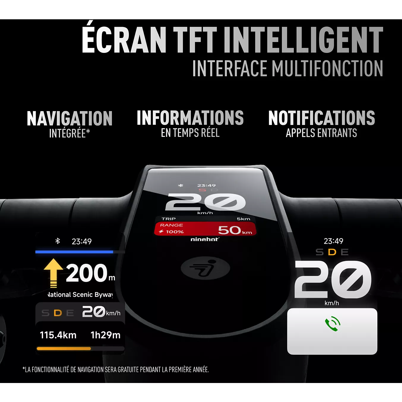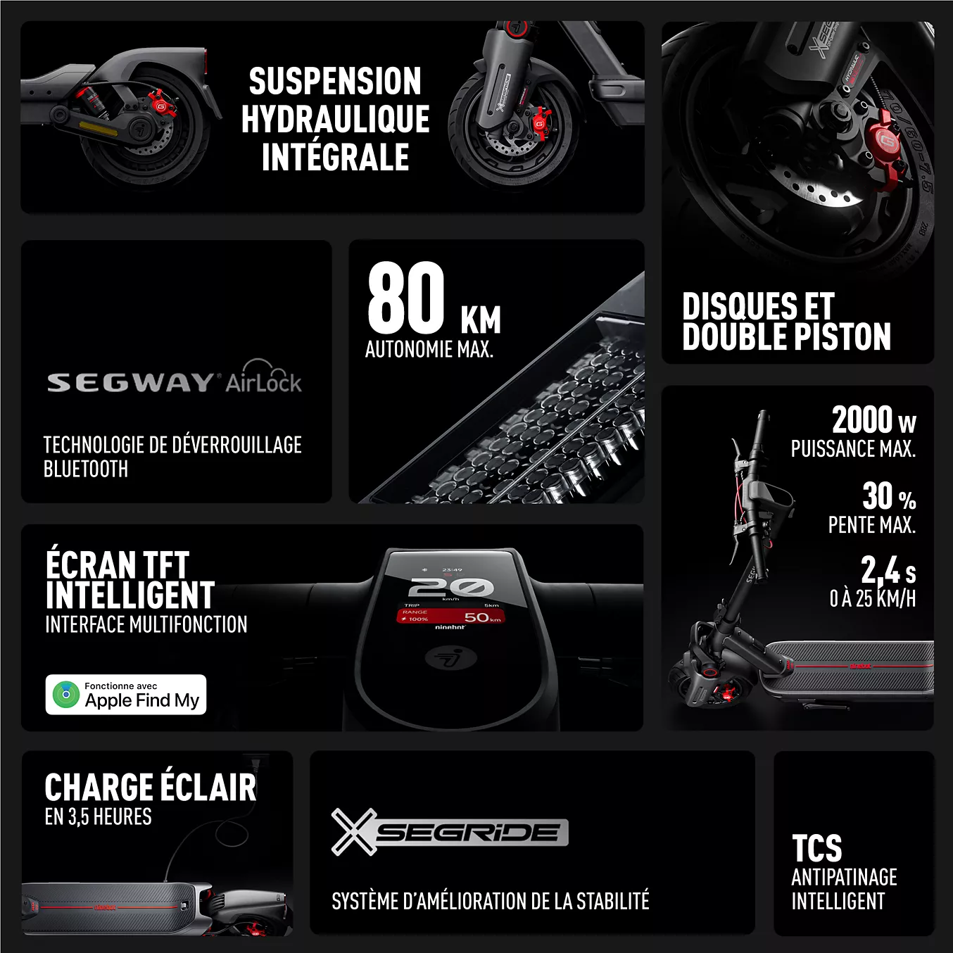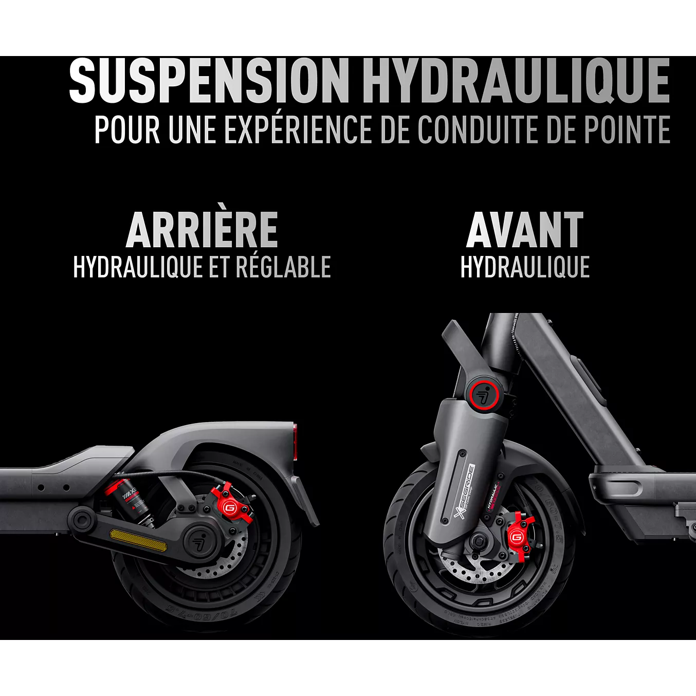 Équipée de suspensions hydrauliques avant et arrière, la NINEBOT Max G3 E garantit une conduite fluide sur tous les terrains. Les pneus tubeless autocicatrisants de 11 pouces offrent une adhérence supérieure et une durabilité accrue. Le système de freinage à disque double piston assure un contrôle optimal, même à grande vitesse. Avec des fonctionnalités intelligentes telles que l’écran TFT pour des informations en temps réel et le système AirLock pour un déverrouillage sans clé, cette trottinette combine confort, sécurité et technologie avancée pour une expérience de conduite inégalée.