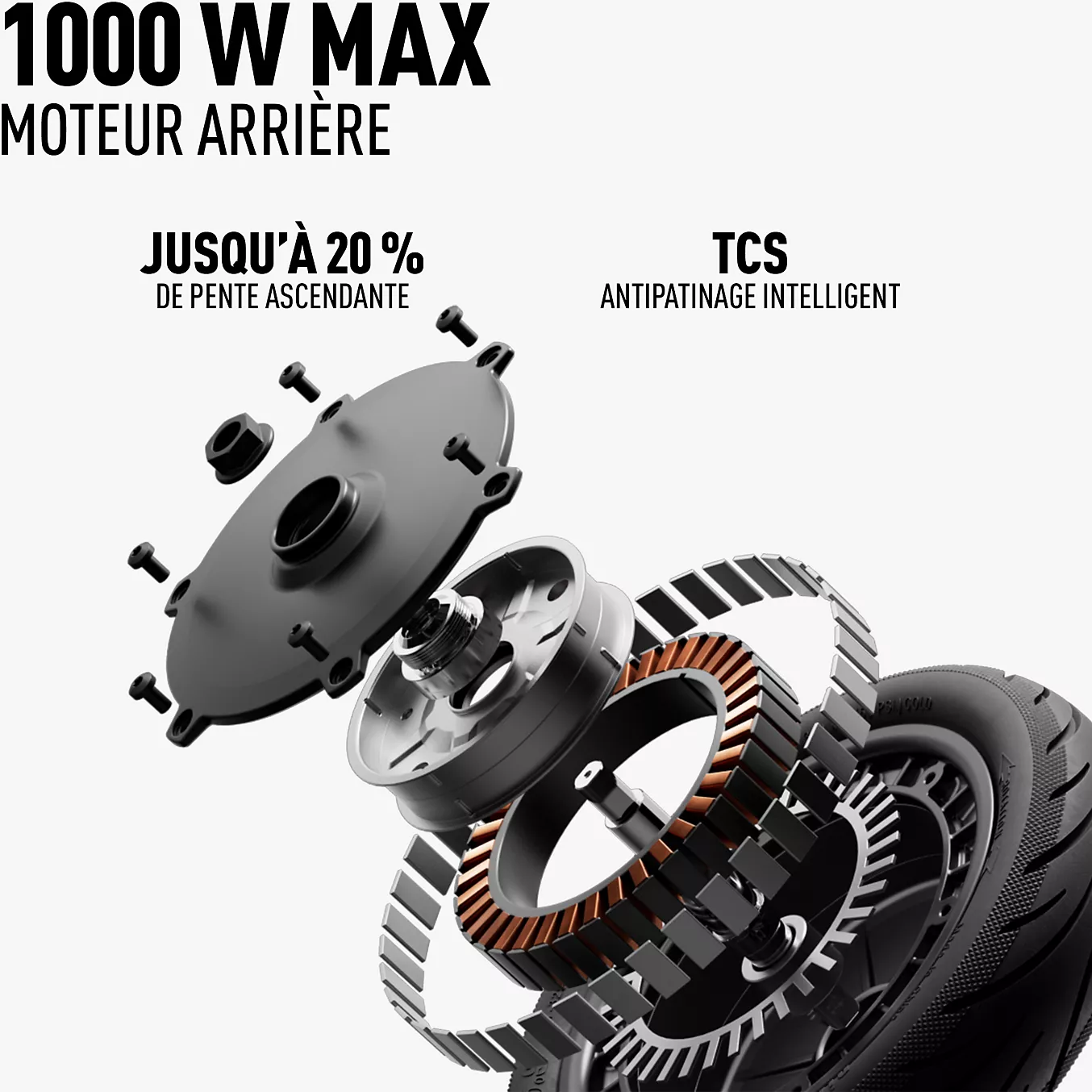La trottinette électrique Ninebot F3 E se distingue par son moteur puissant de 1000 W, offrant une vitesse maximale de 25 km/h et une capacité de montée jusqu’à 20 %. Grâce à sa technologie SegRange™, elle propose une autonomie impressionnante allant jusqu’à 70 km en mode Eco. Les pneus tubeless autocicatrisants de 10 pouces garantissent une stabilité et un confort accrus, tandis que le système de freinage à disque à l’avant et E-ABS à l’arrière assure une sécurité optimale. La suspension hydraulique avant et le bras oscillant arrière permettent de naviguer aisément sur les routes urbaines, même les plus accidentées.