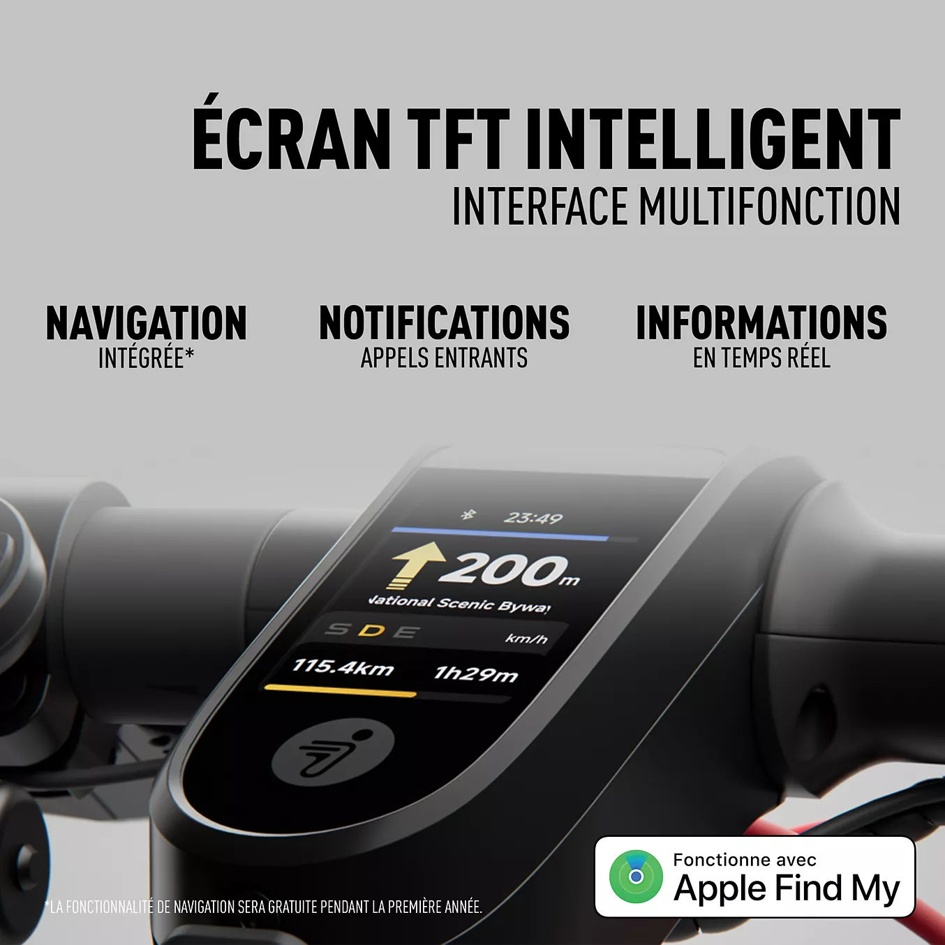 Équipée d’un écran TFT intelligent, la Ninebot F3 E offre des informations en temps réel et une fonction de navigation pratique. Le système AirLock permet un déverrouillage Bluetooth basé sur la proximité, tandis que l’intégration avec Apple Find My facilite la localisation de votre trottinette. Avec ses trois modes de conduite et une fonction Marche, elle s’adapte à tous vos besoins. La batterie de 477 Wh se recharge en 8 heures, et l’indice d’étanchéité IPX6 assure une protection contre les projections d’eau. Enfin, son design pliable permet un rangement aisé, faisant de la F3 E un choix idéal pour les déplacements quotidiens.