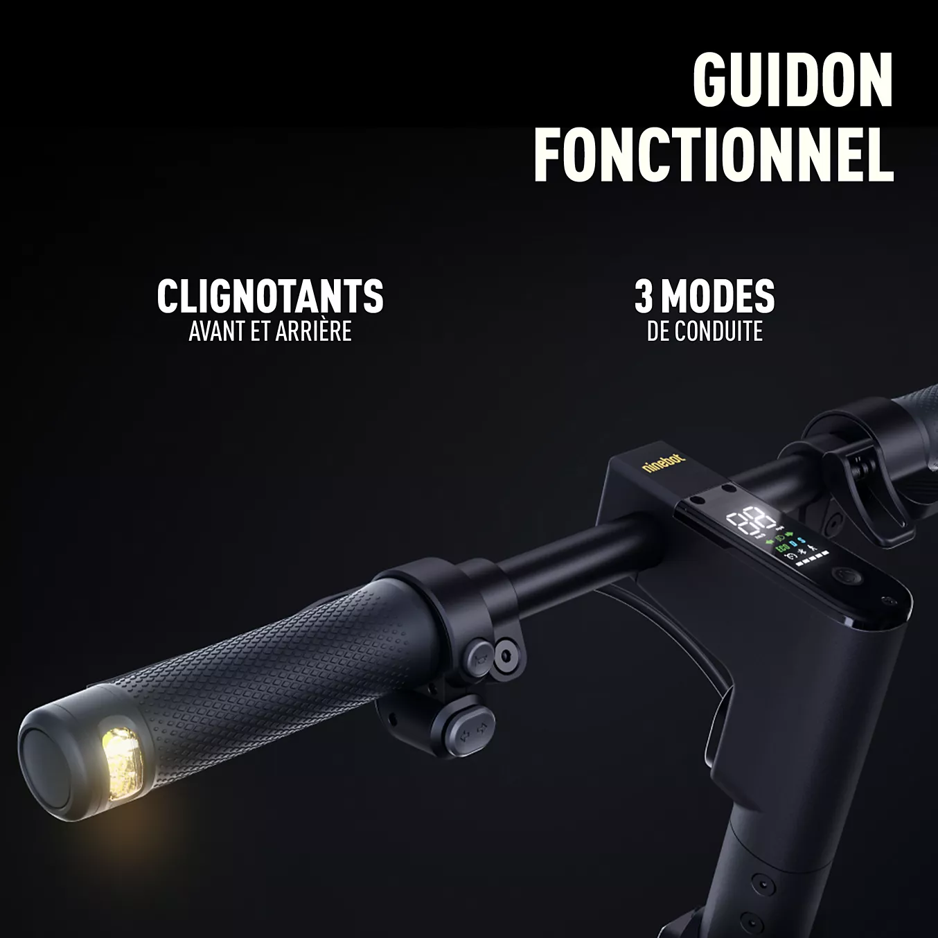 L’écran LED clair et intuitif intégré à la trottinette électrique NINEBOT Max G2E vous permettra de garder un oeil sur toutes les informations relatives à la vitesse, au mode d’alimentation et au niveau de la batterie ; facile à lire, ce sera un excellent indicateur de conduite en temps réel.